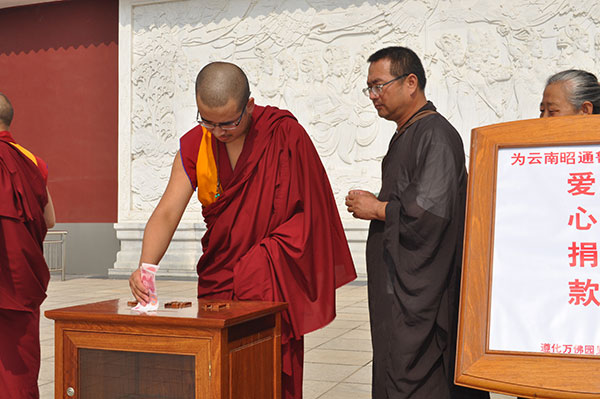 8月10日(阴历七月十五)上午,是传统的盂兰盆节(俗称为中元节、鬼节)万佛园举行了盛大的盂兰盆大型超度祈福法会,在法会开始前,号召广大僧众、居士、信众为云南昭通鲁甸灾区捐款的倡议活动,献出一份爱心。在金宝塔前进行捐赠仪式,为众生祈福、为遇难同胞超度亡魂,愿逝者安息!愿生者平安、吉祥!所捐得善款将全部捐赠给云南昭通鲁甸灾区。