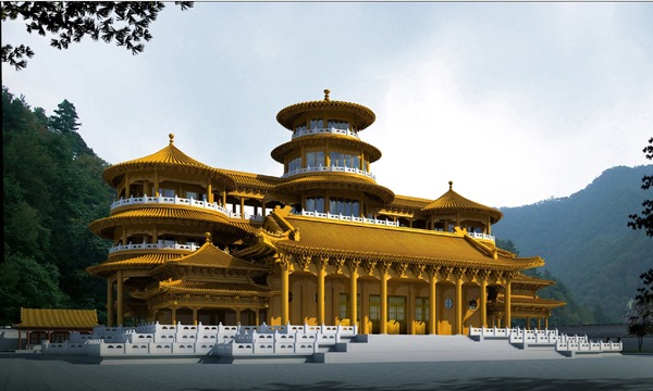 金殿是采用黄铜浇注而成,屋顶用黄金贴铜瓦砌成,建筑建成后将是万佛园的景区位置最高的建筑,整个建筑顶以园为建筑形式,墙体以方形。气势雄伟庄严,绚丽多姿,美不胜美,整座金殿用高、圆、黄三点体现了金殿的崇高、想和、绚丽的独特意境。